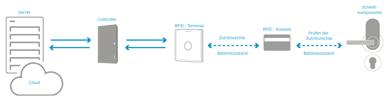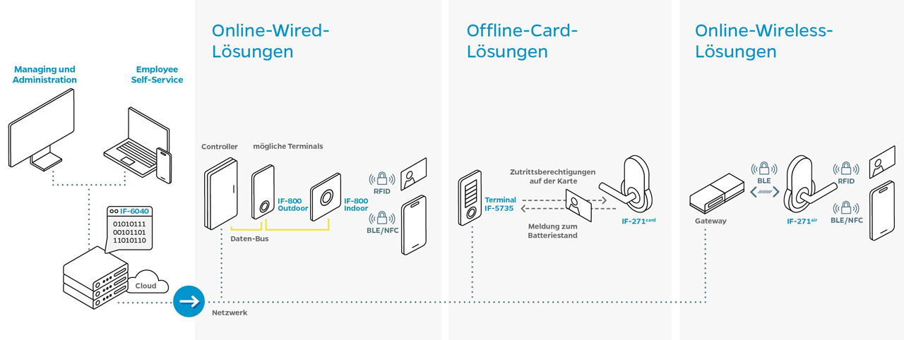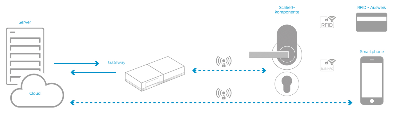Verwaltung der Rechte Zentral, in Echtzeit (verkabelt)Zentral, in Echtzeit (drahtlos)Zentral (über Karten­synchronisation)Zentral, in Echtzeit (verkabelt)Zentral, webbasiert über Cloud-Dienste