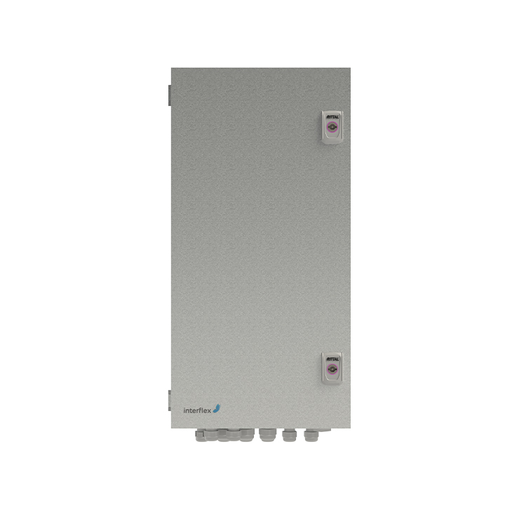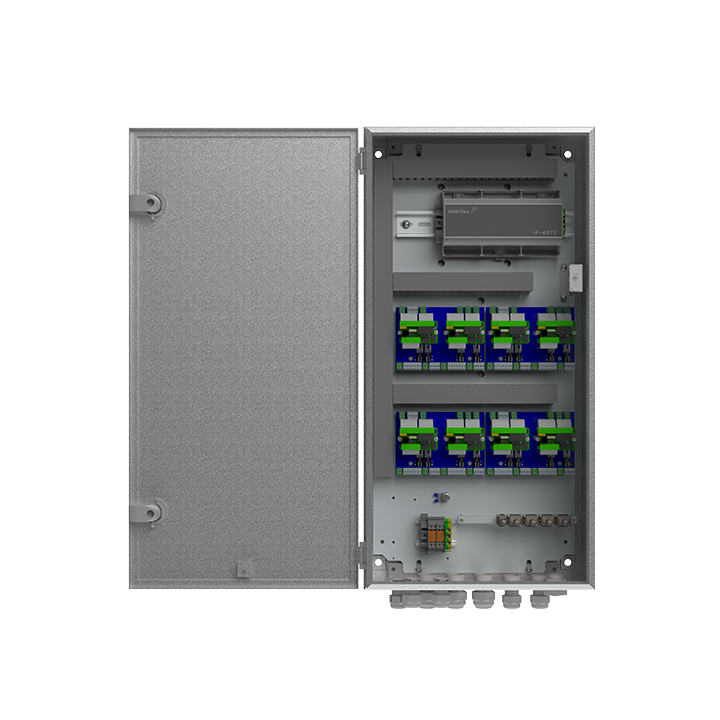 Den IF-Verteiler im großen Wandgehäuse können Sie für bis zu acht Türen konfigurieren. Es gibt ihn mit oder ohne Netzteil und je nach Ausstattung mit oder ohne Controller von Interflex. Per Ethernet schließen Sie ihn an das Zutrittskontrollsystem IF-6040 an und verbinden so die Türen mit dem System, wenn der Verteiler einen Controller hat. Um Verkabelungsaufwand vor Ort zu minimieren, sind im Verteiler I/O-Controller-Boards integriert. Jedes Board wird mit einem Terminal und einem Stellglied verbunden, beispielsweise mit einem Türöffner oder mit einem Drehkreuz. Die Eingangssensoren sind auch als Melde-, Ereignis- oder Zählkontakt bis maximal 20 Hz konfigurierbar. Zusätzlich verfügt jedes Board über einen Ausgangskontakt mit einer Schaltleistung von bis zu 30 V / 2 A.